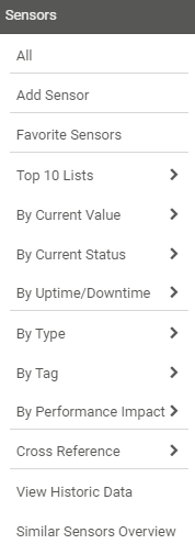 Open a list of sensors filtered by different parameters. Hover over By Uptime/Downtimeto show other options. Follow the menu path to view lists of all sensors sorted by