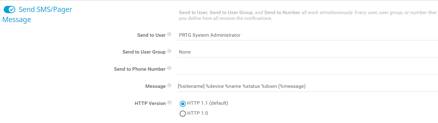 Send to User, Send to User Group, and Send to Email Address all work simultaneously. Because of this, you can define more than one user as a recipient of this notification. PRTG sends the email notifications to the active email notification contacts of the user that you select, to the active email notification contacts of all members of the user group that you select, and to all email addresses that you enter under Send to Email Address.