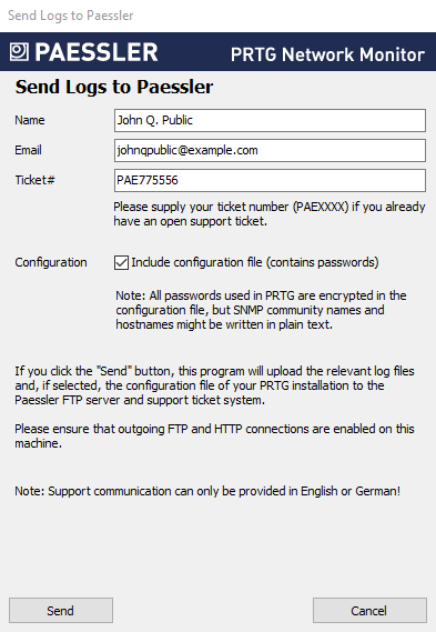 Click Send to start the data upload. PRTG then automatically collects, compresses, and sends your logs to our FTP over SSL (FTPS) server. Make sure that FTPS and HTTP connections are allowed on the remote probe system.