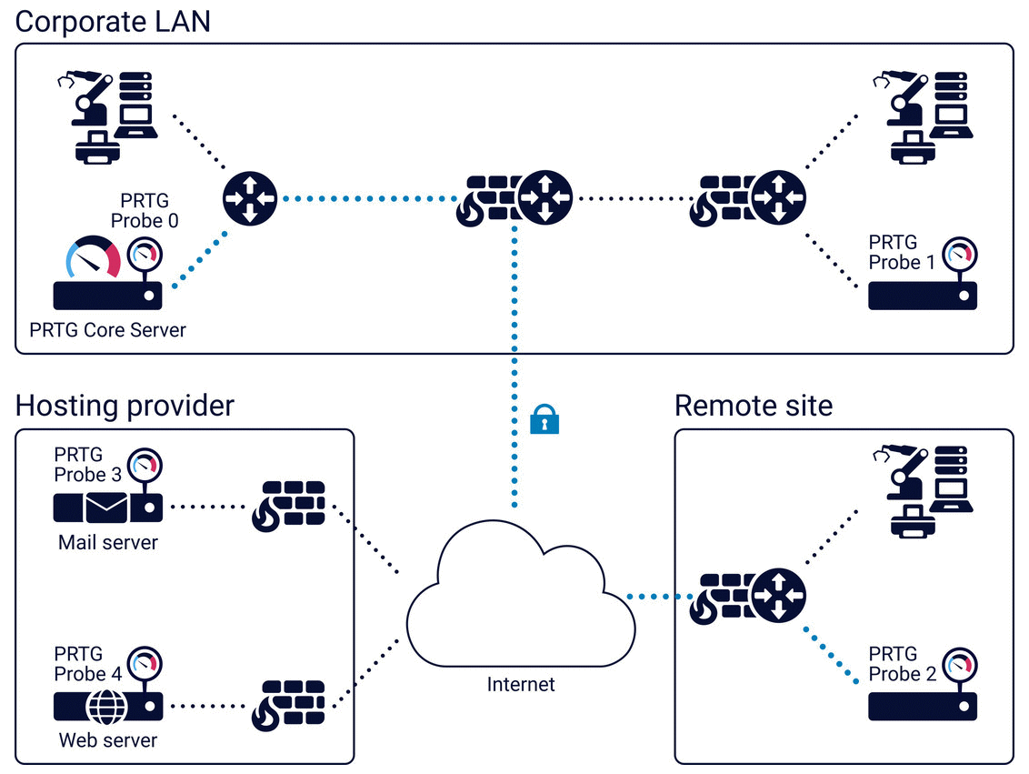 The PRTG core server inside the corporate LAN (top left) can monitor: